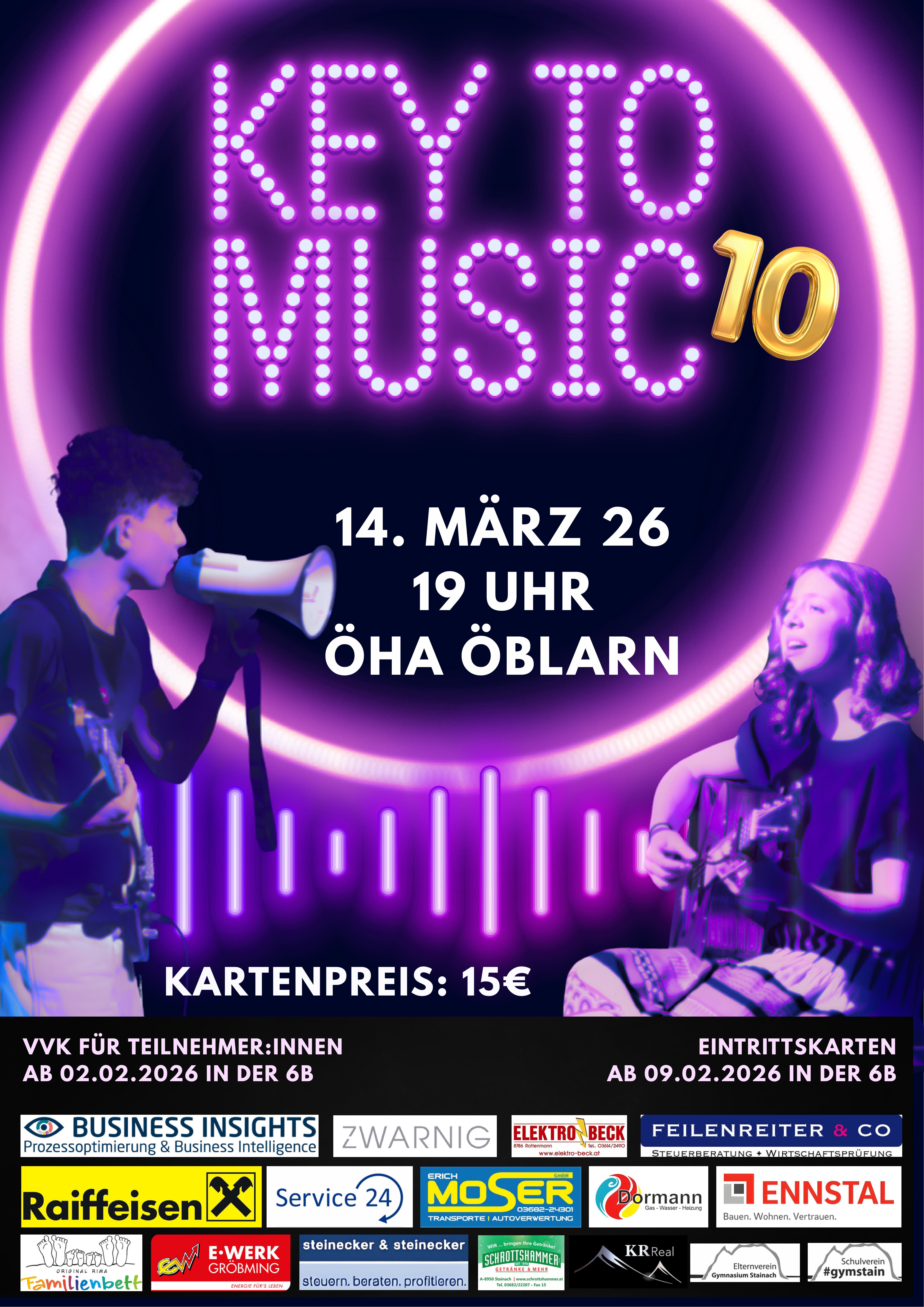 Am Samstag, dem 14. März 2026, wurde das ÖHA in Öblarn beim Jubiläumskonzert „Key to Music 10“ des BG/BRG Stainach zum Zentrum der regionalen Musikszene. Vor einem restlos ausverkauften Haus präsentierten Schülerinnen und Schüler, Absolventinnen und Absolventen sowie Lehrkräfte in Kooperation mit den Musikschulen Gröbming und Liezen in 24 Acts ein mitreißendes Musik- und Tanzprogramm auf höchstem Niveau.
